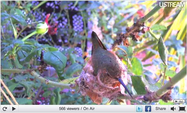 Phoebe, a Channel Island Allen Hummingbird on her nest in Orange County, CA, May 29, 2011/Pungh0li0, USStream Mobile, usstream.tv