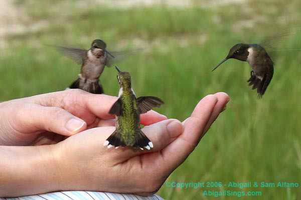 Abigail Alfano hand-feeds hummingbirds, Franklinton, LA, Sept 14 2006/Sam Alfano, AbigailSings.com