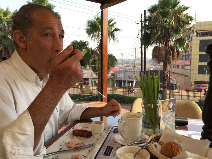 Marc enjoys a big breakfast, Le Petit Village, Kampala