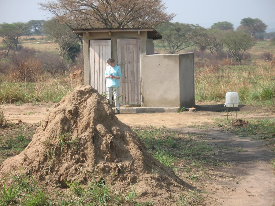 Gini exiting outhouse, termite mound in foreground, Queen Elizabeth National Park
