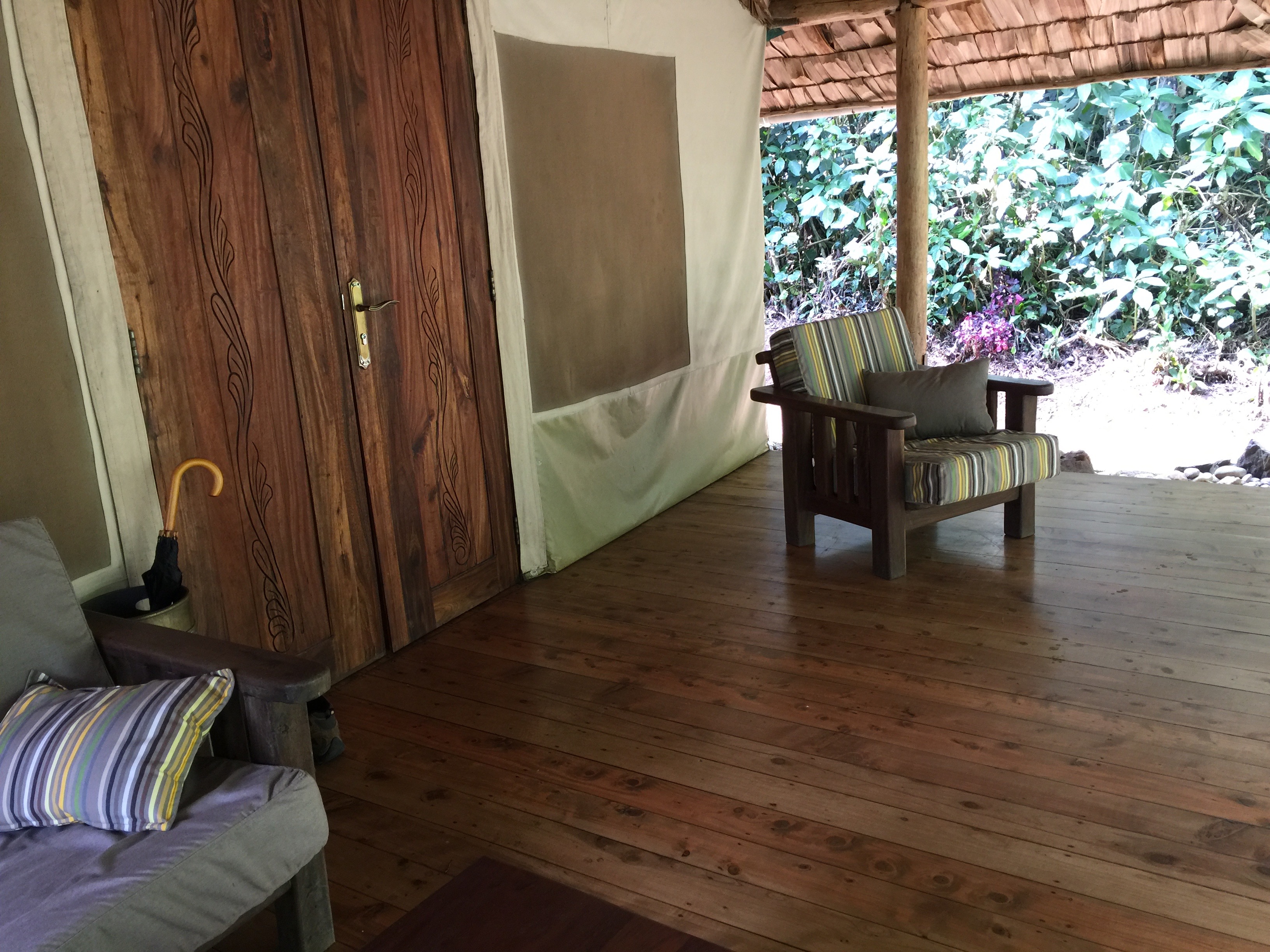 Porch of “Flycatcher,” the name of our tented cabin, Sanctuary Gorilla Forest Camp, Bwindi Impenetrable NP