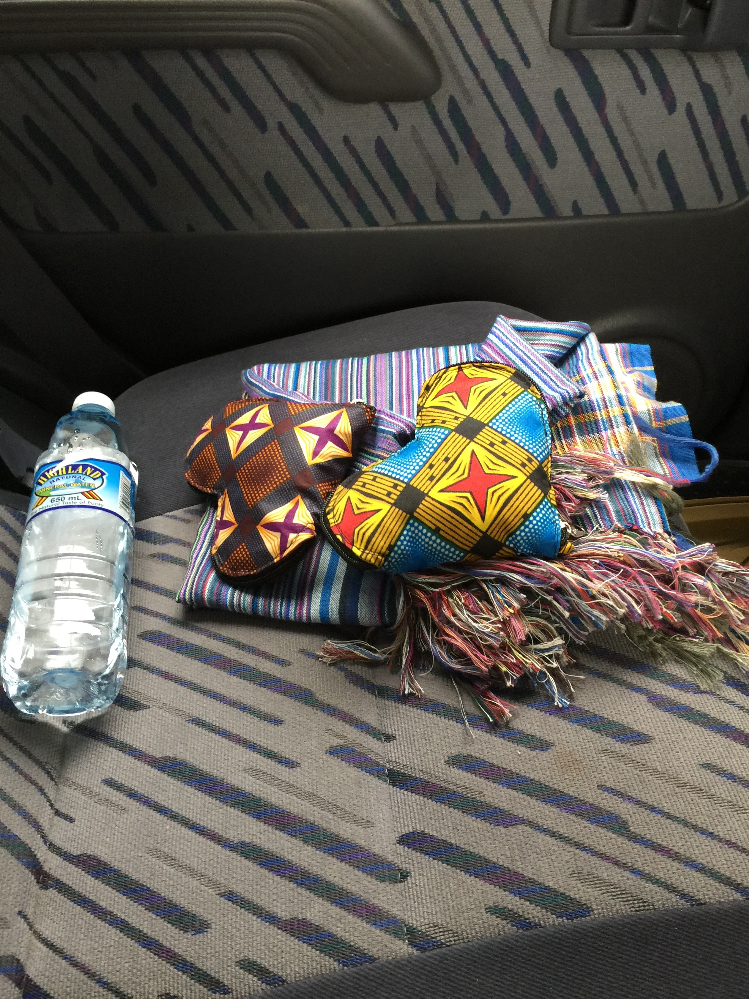 Craft-market purchases on backseat of Toyota Land Cruiser, heading to Kinigi