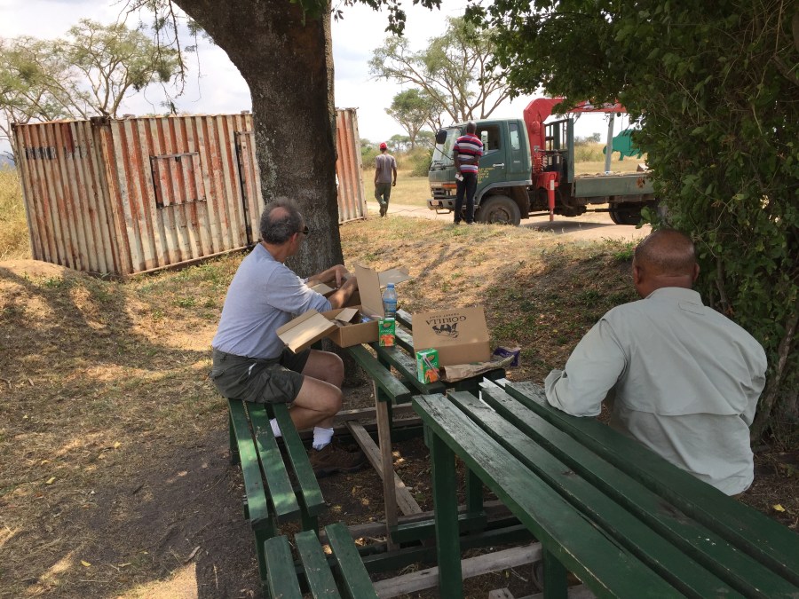 Marc and Kenneth during lunch break, watching men haul shipping container meant to be converted into someone’s home, Queen Elizabeth NP