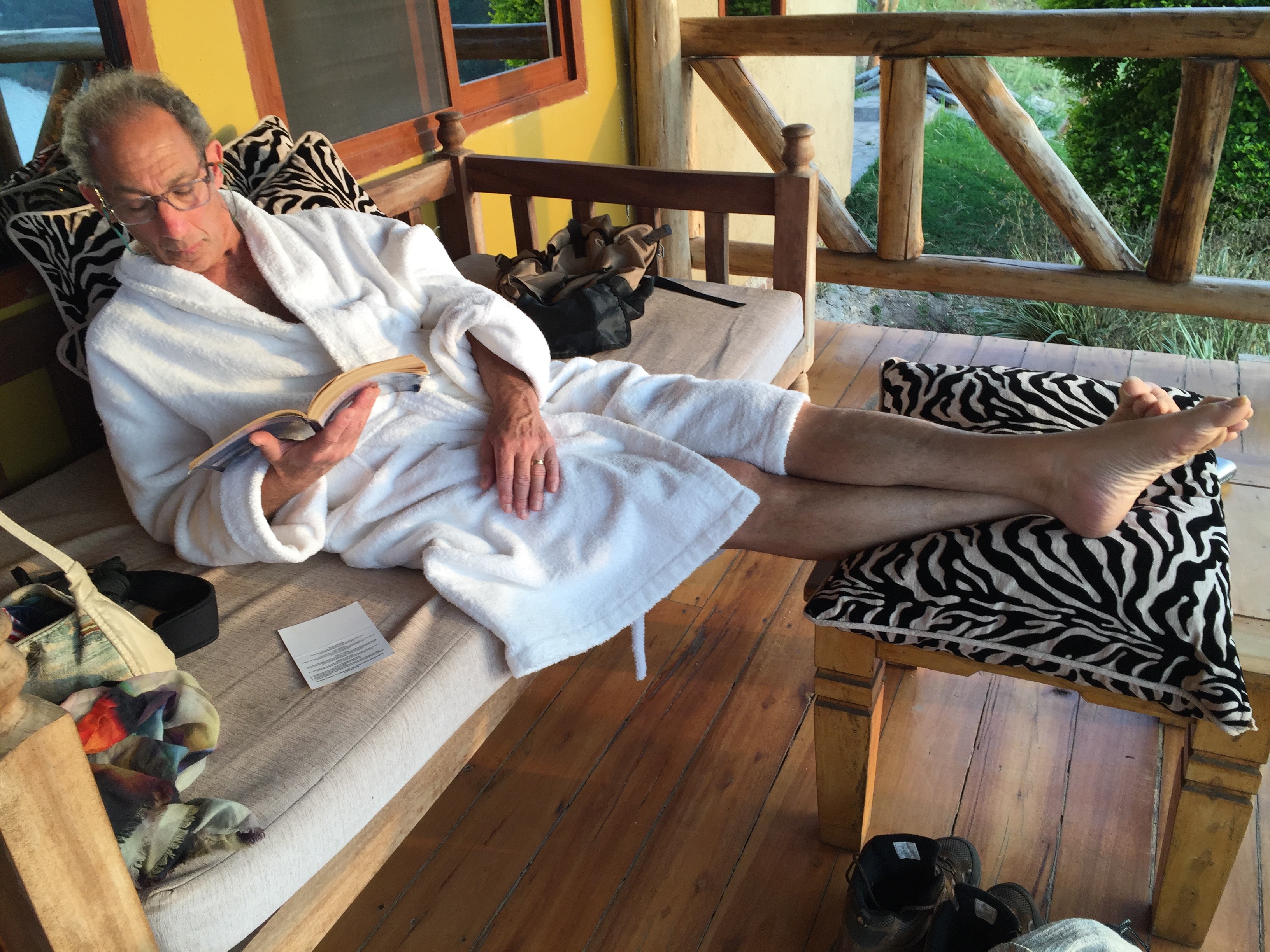 Marc reading on our porch, Crater Safari Lodge, Lake Nyinabulitwa