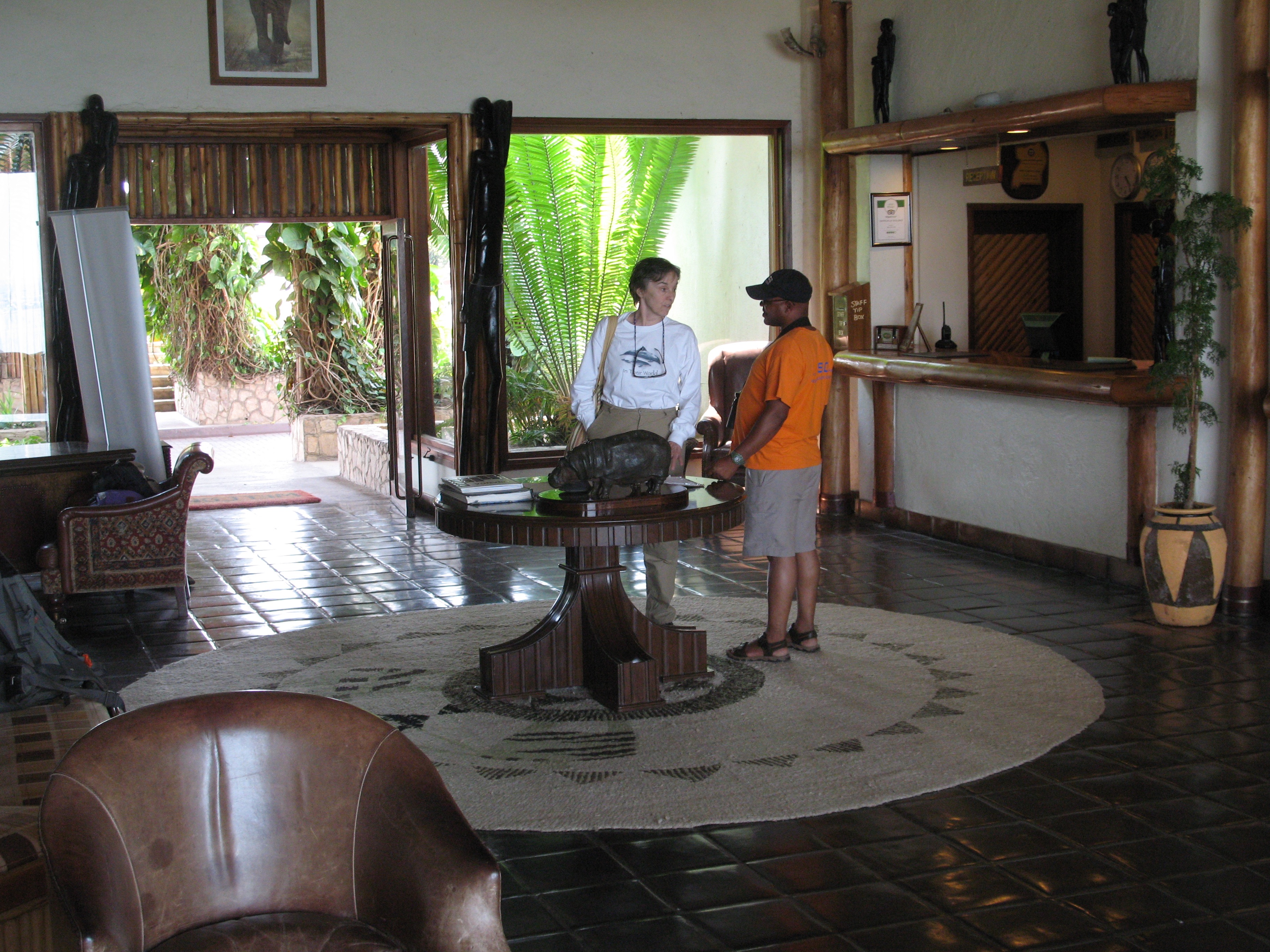 Gini and Kenneth, lobby of Mweya Safari Lodge, Queen Elizabeth NP
