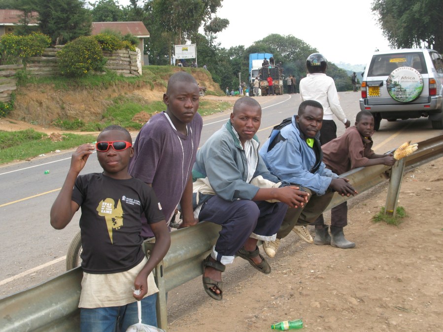 Young man models sunglasses after I told him I liked them during vista stop, road to Lake Bunyonyi