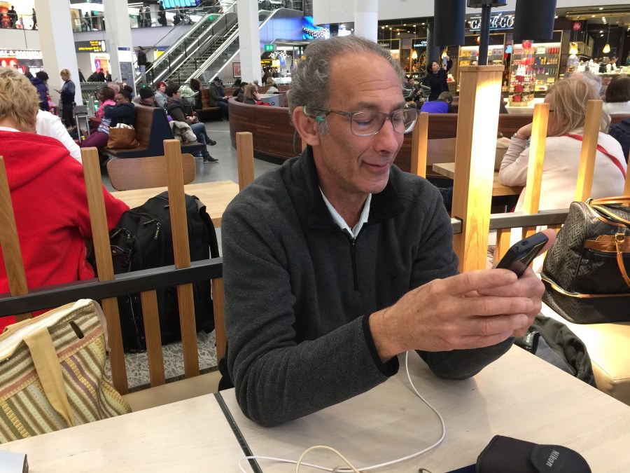 Marc reviewing trip photos, main concourse, Schiphol Airport, Amsterdam