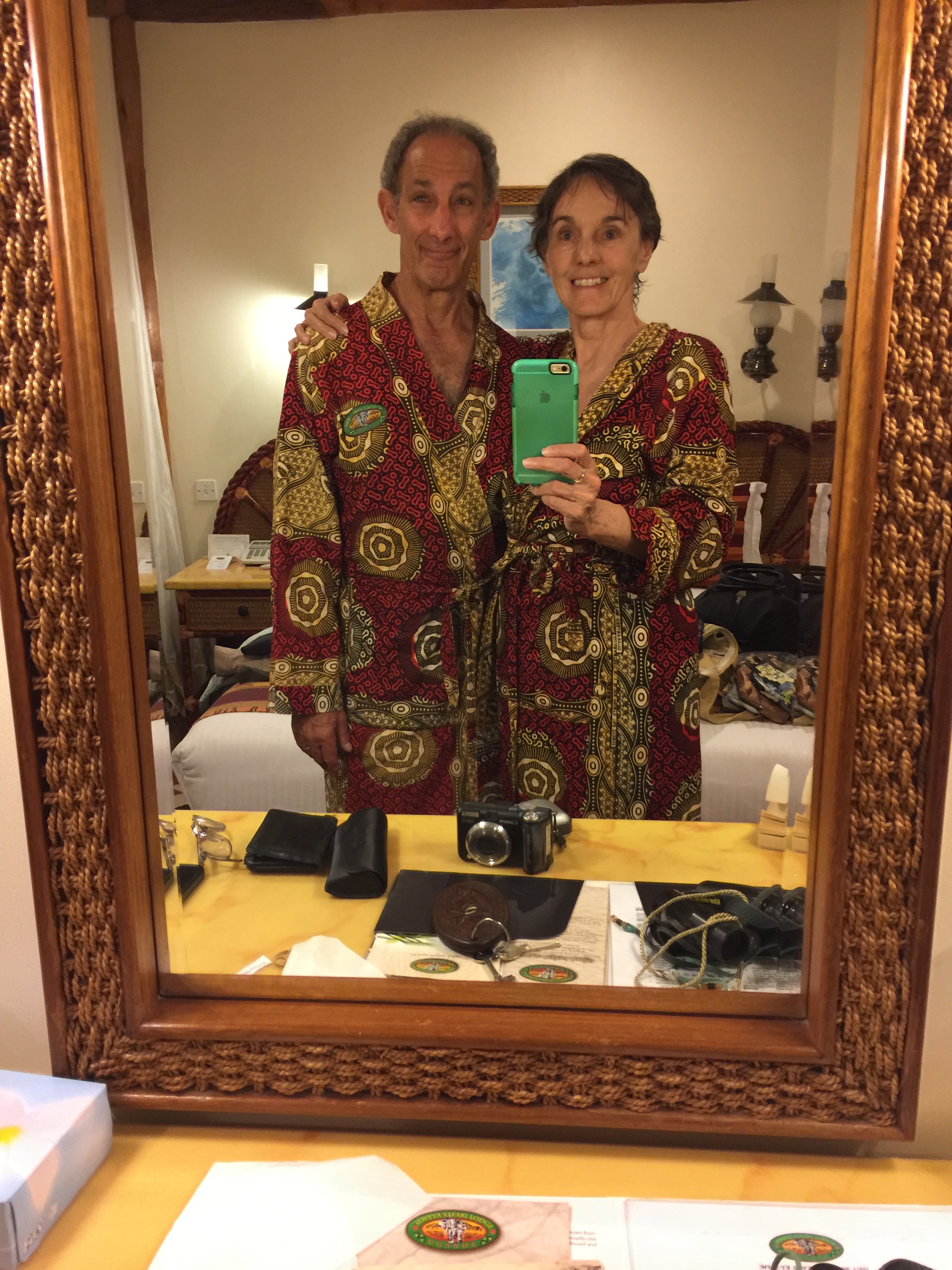 Relaxing in robes we now wish we had purchased after another full day, Mweya Safari Lodge, Queen Elizabeth NP