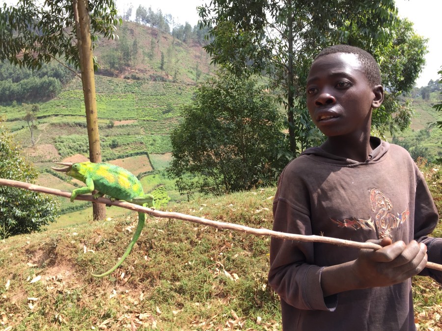 Boy with rhinoceros chameleon, Bwindi Impenetrable NP