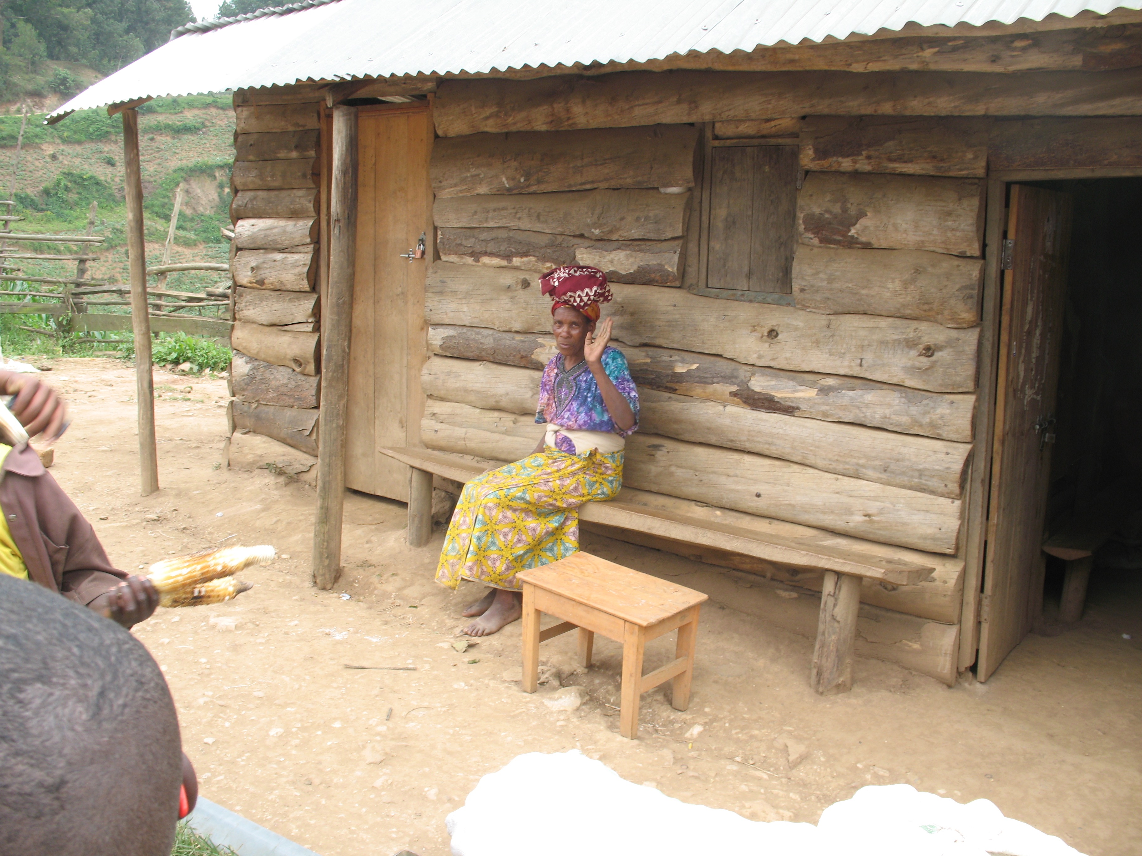Woman outside cabin waving off Marc’s camera, vista stop, road to Lake Bunyonyi