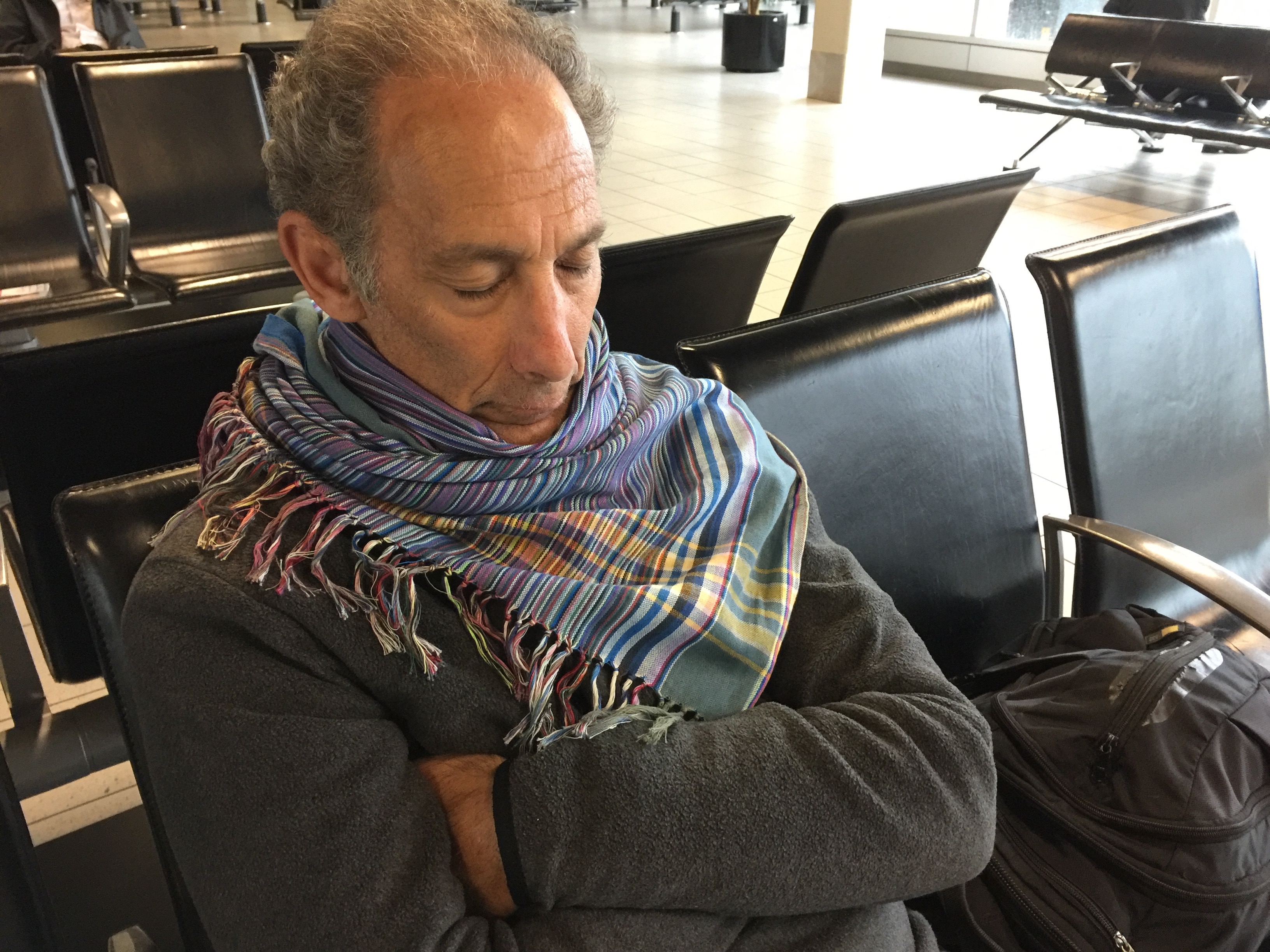Marc napping in boarding area for flight to JFK, with the wrap Gini bought on our firstday in Rwanda — called a kikoy in Uganda —keeping him warm, Schiphol Airport, Amsterdam