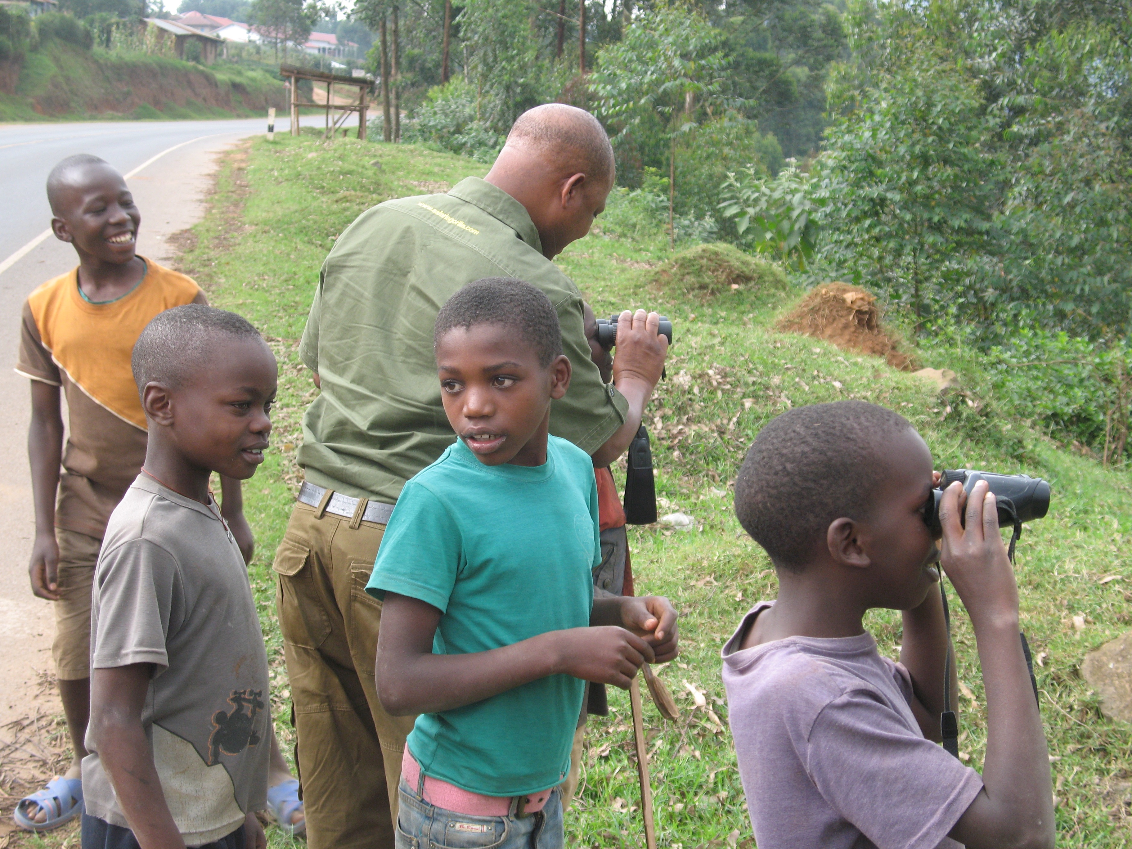 Boys waiting their turn for first look through binoculars, road to Lake Bunyonyi