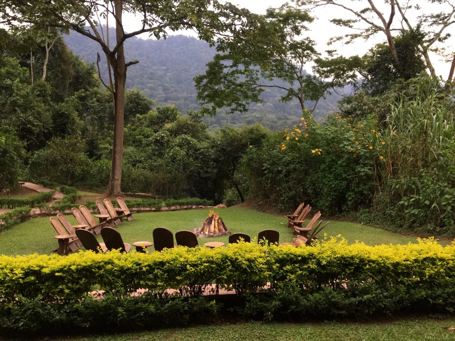 Lawn chairs around fire pit, Sanctuary Gorilla Forest Camp, Bwindi Impenetrable NP