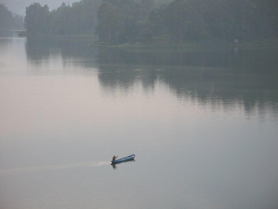 Man in canoe, returning from market on shore of Lake Bunyonyi