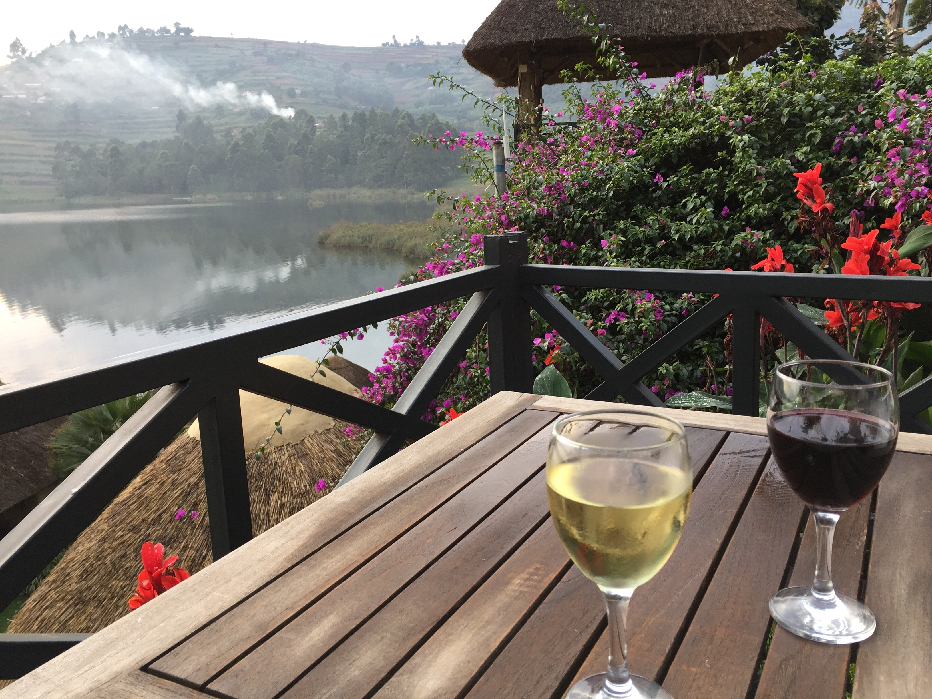 Wine on lodge terrace, BirdNest Resort, Lake Bunyonyi