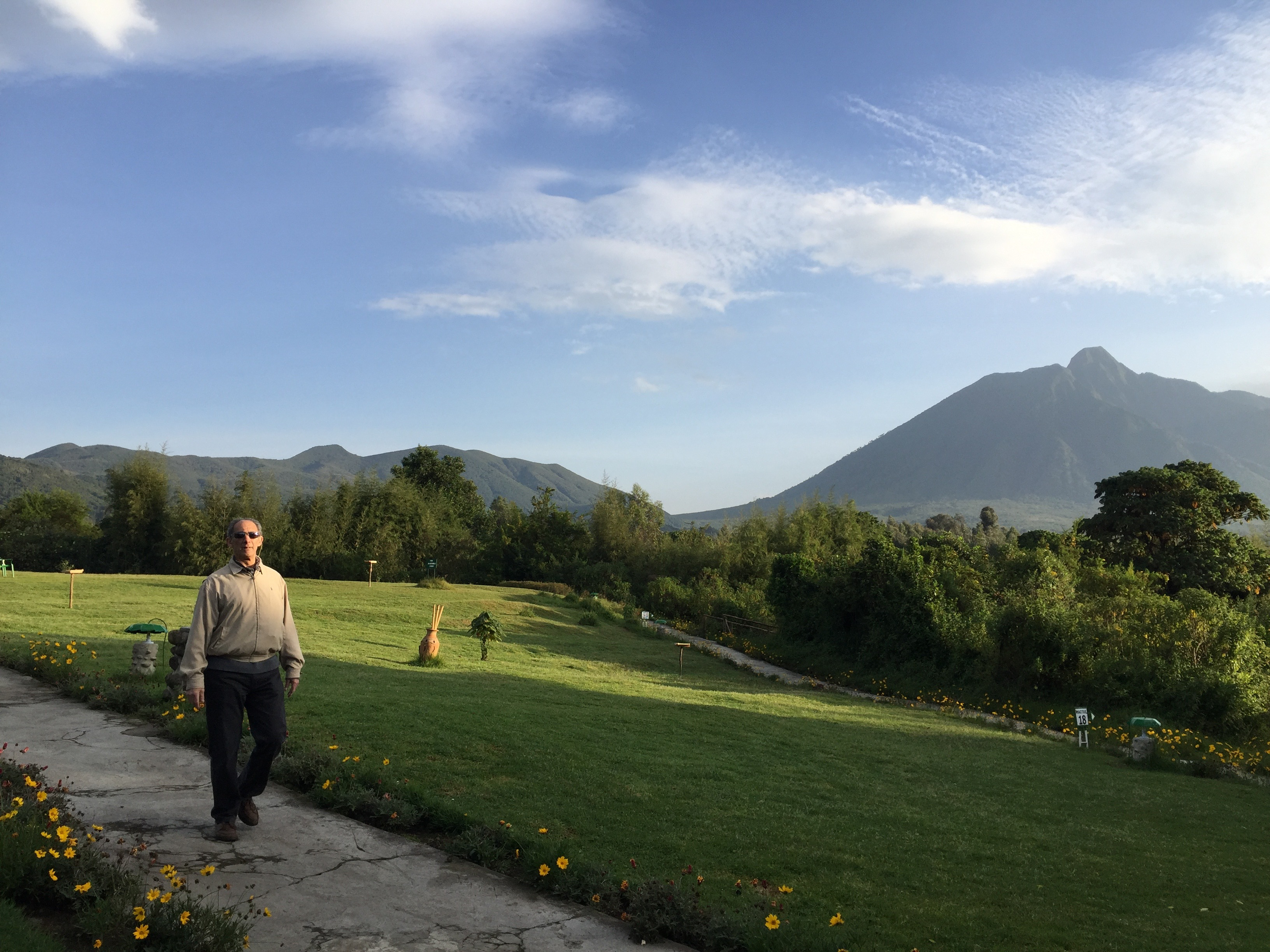 Marc strolling on clear morning from our cottage to main pavilion, Gorilla Mountain View Lodge, Kinigi