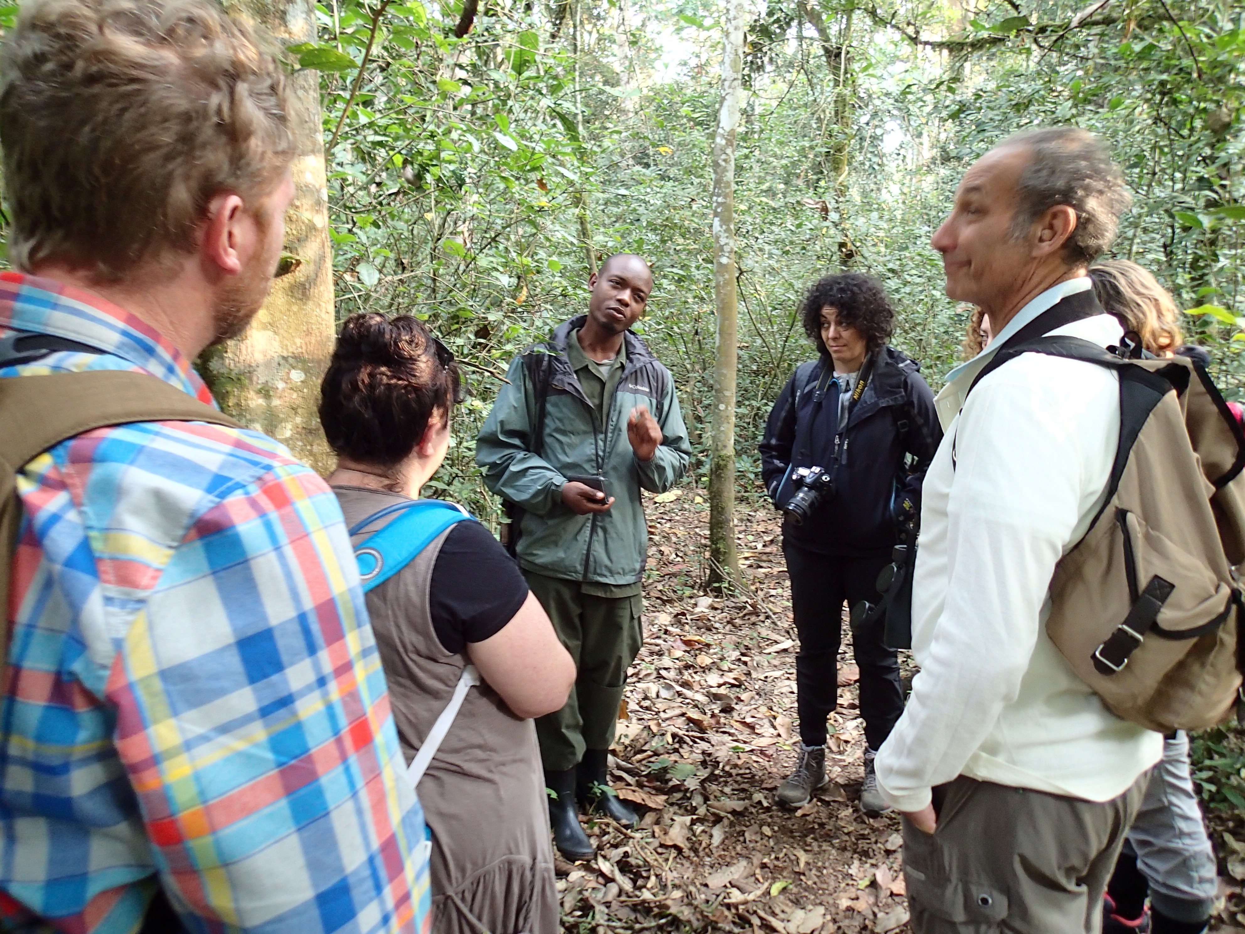 Our guide, Moses, giving us an orientation at start of chimpanzee trek with Miss Chatterbox to his left, Kibale Forest NP