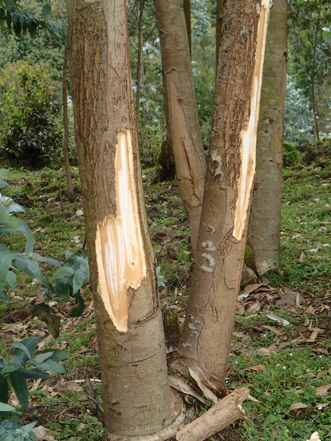 Eucalyptus tree after female was through ripping off bark and scraping pulp, farmland bordering Volcanoes NP, Kinigi