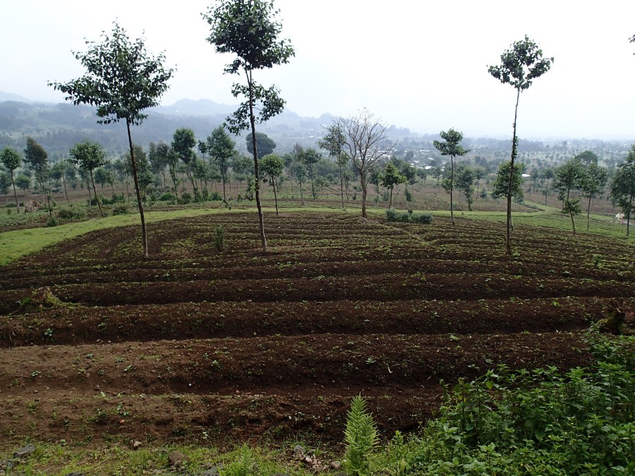 Farmland at base of mountain, border of Volcanoes NP