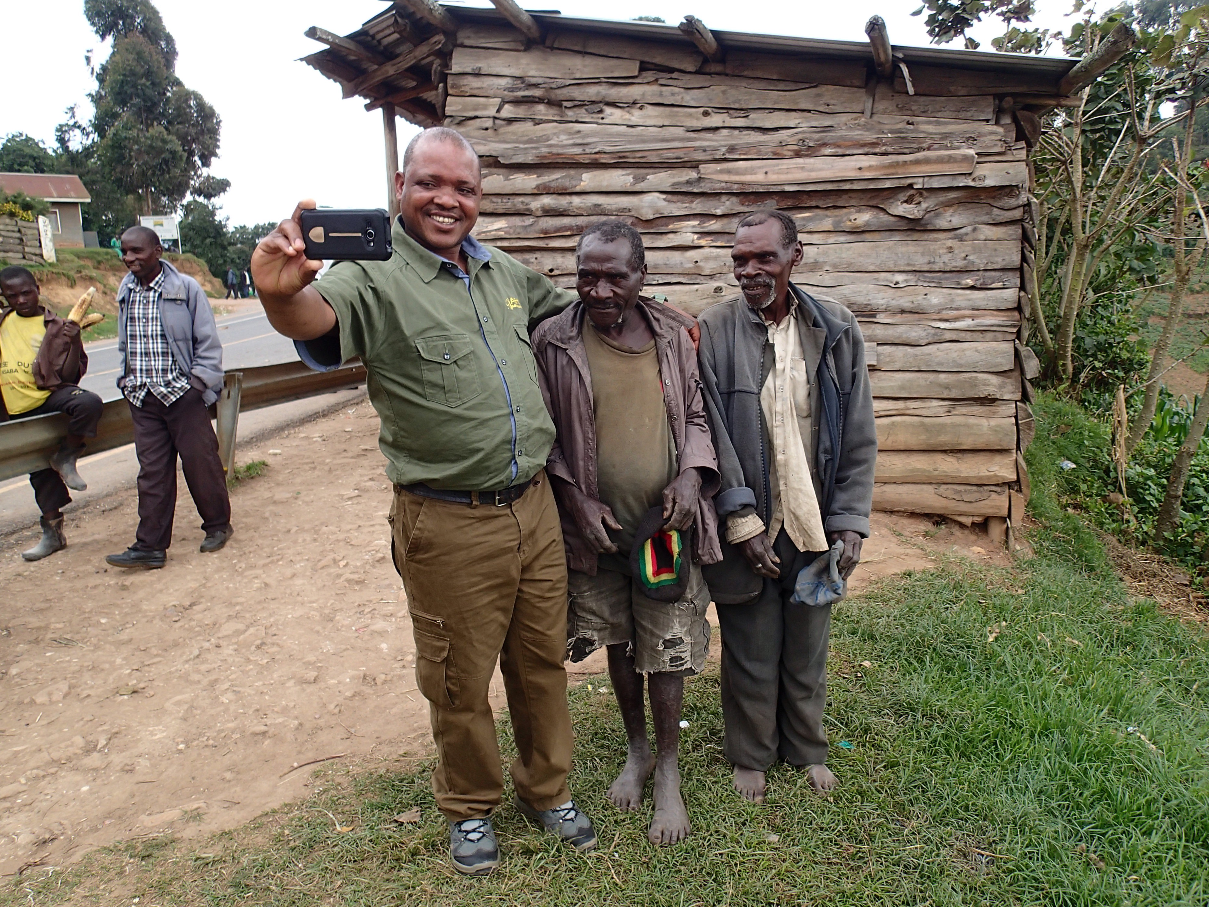 Kenneth takes selfie with two Batwa men during vista stop, road to Lake Bunyonyi