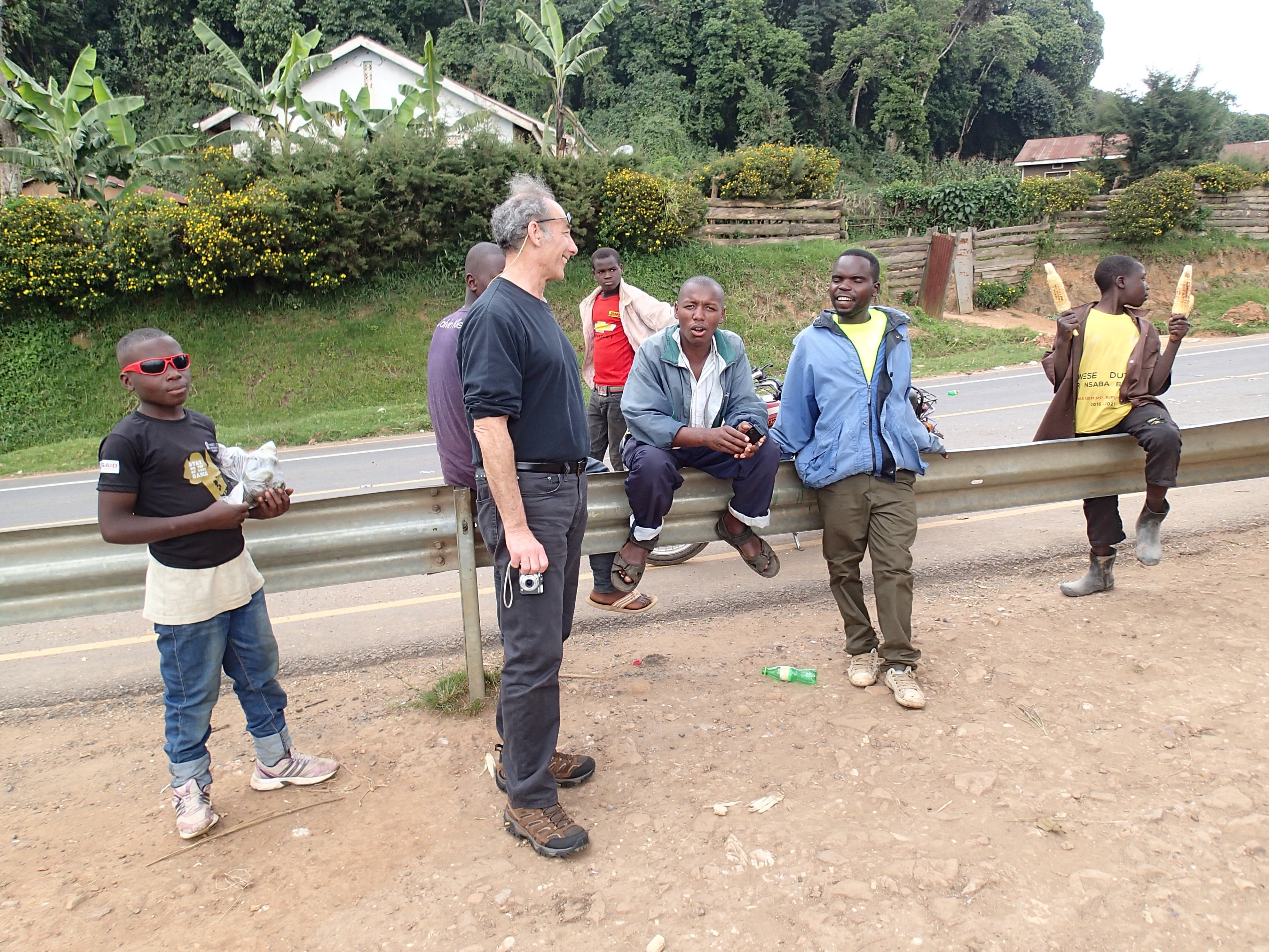 Marc banters with cool kids during vista stop, road to Lake Bunyonyi