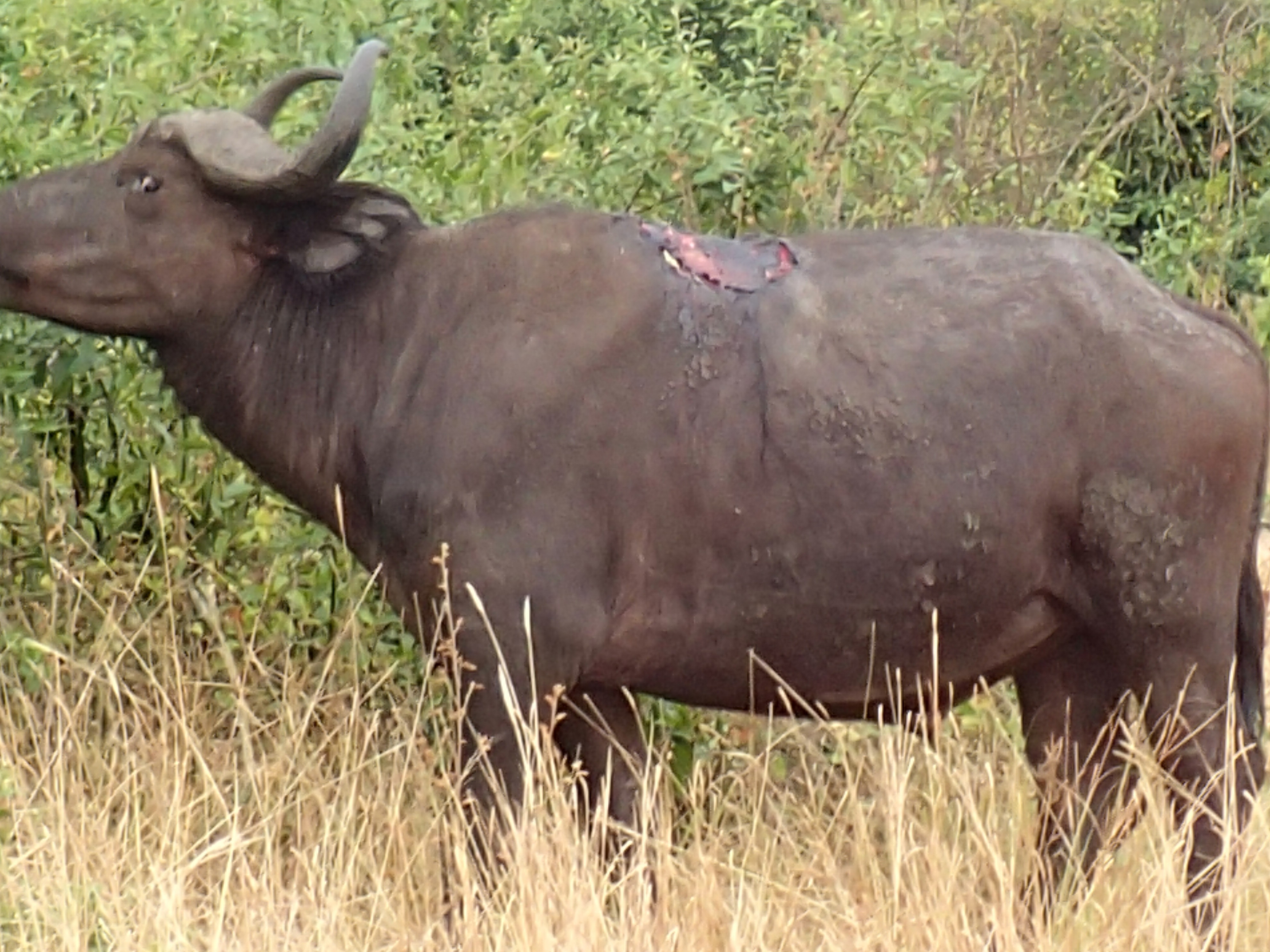 Cape buffalo recently attacked by lion, Queen Elizabeth NP