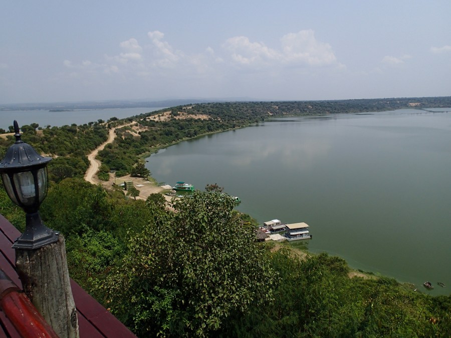 View of Kazinga Channel (right), Lake Edward (left) from pool deck, Mweya Safari Lodge, Queen Elizabeth NP