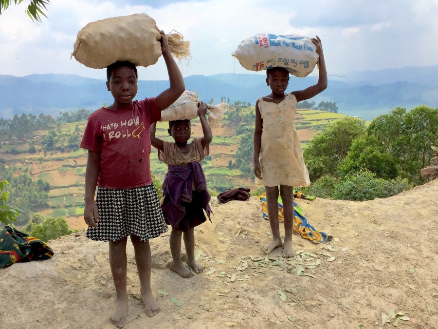 Three girls who’ve just climbed a steep slope with sacks, road to Bwindi