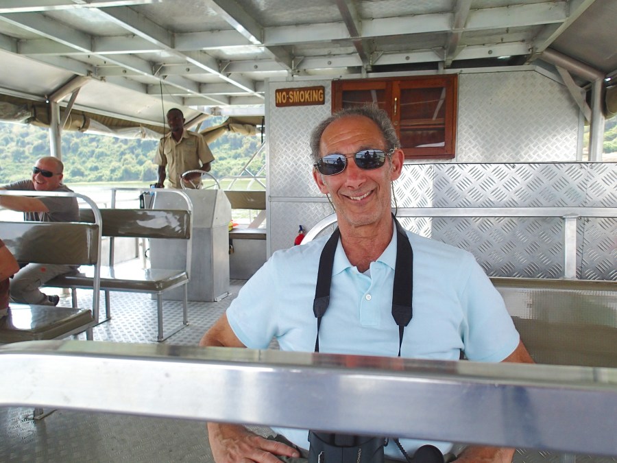 Marc on boat, ready for tour of Kazinga Channel, Queen Elizabeth NP