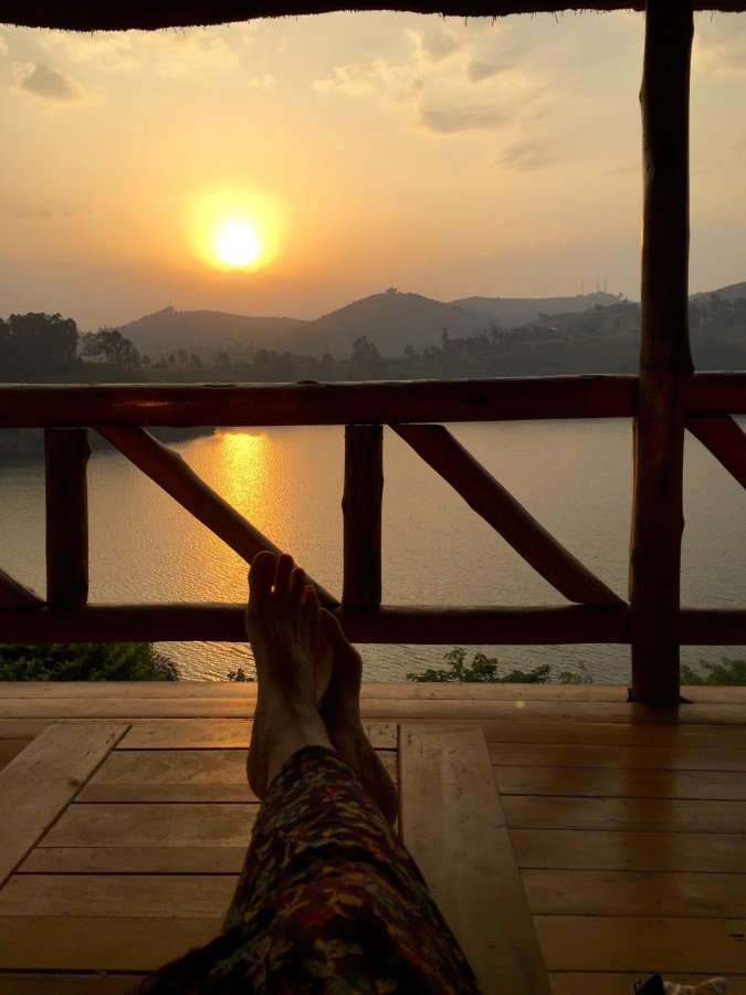 Gini relaxing on the porch before dinner, Crater Safari Lodge,Lake Nyinabulitwa