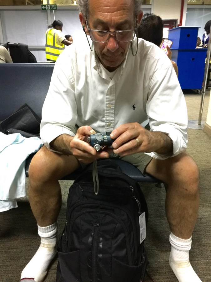 Marc checking his camera in waiting area prior to departure, Entebbe Airport