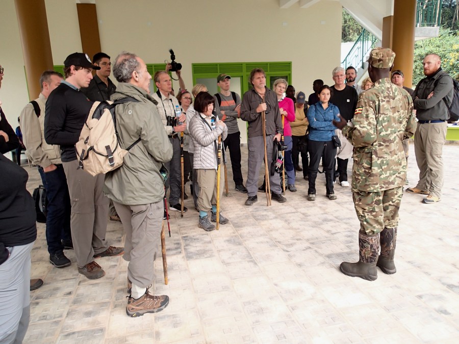 Marc and other trekkers being welcomed to new park headquarters, a short walk from our lodge, Bwindi Impenetrable National Park