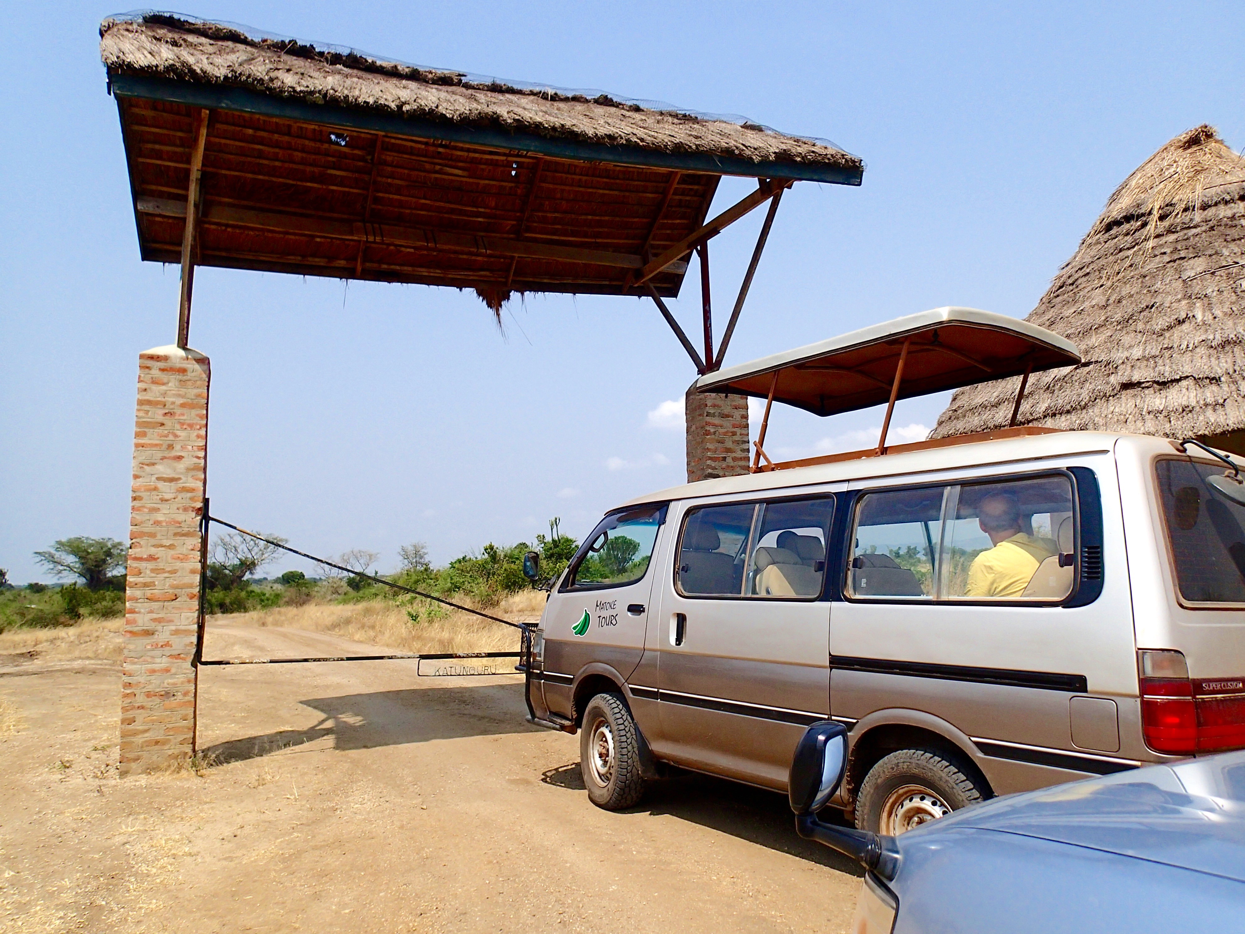 Tourist van clearing as Kenneth deals with guards at gate to Mweya Peninsula