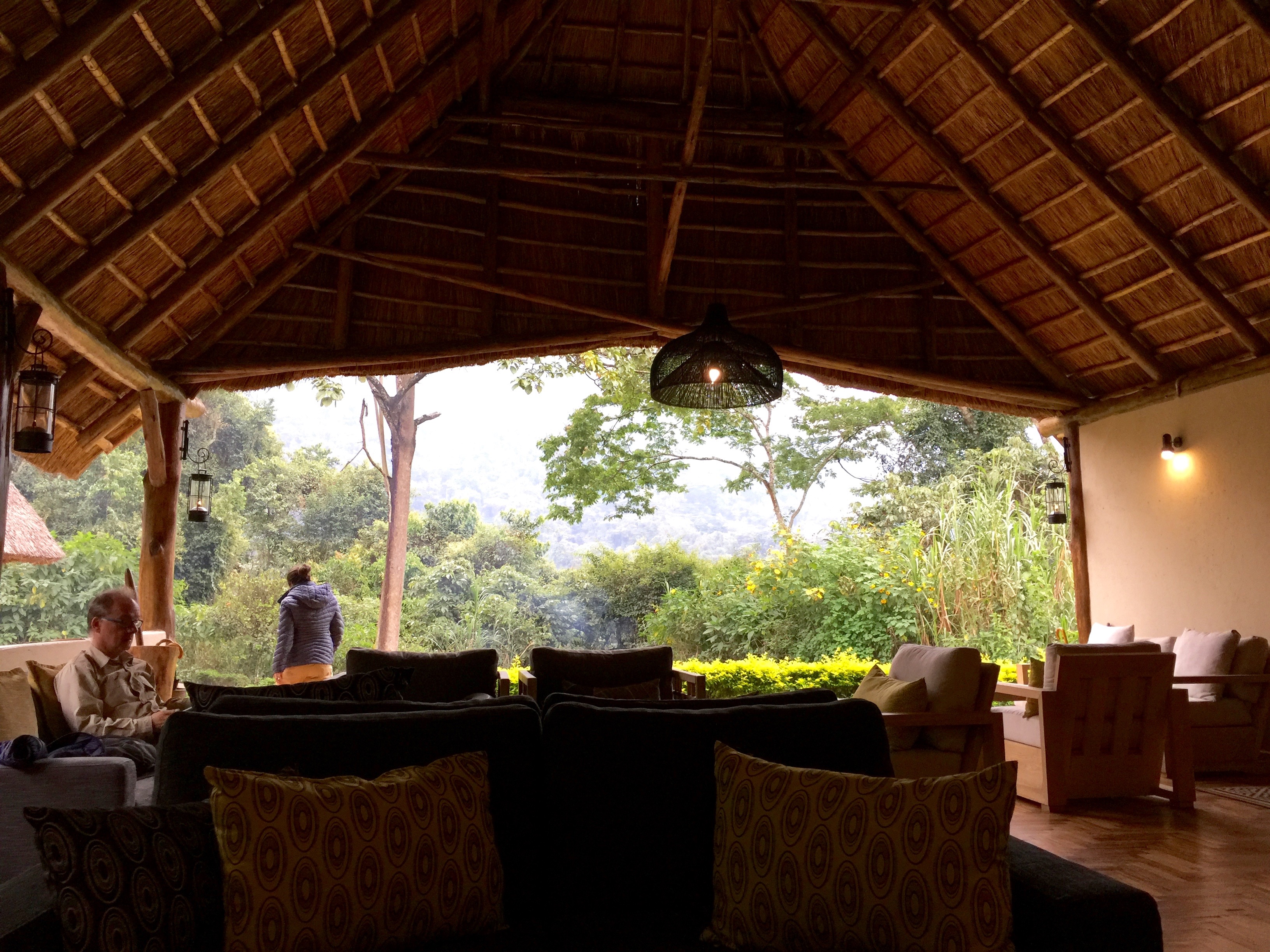 Relaxing in lounge, waiting for Marc to return from second gorilla trek, Sanctuary Gorilla Forest Camp, Bwindi Impenetrable NP